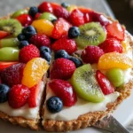 A delightful fruit pizza topped with a creamy cream cheese glaze and fresh seasonal fruits.