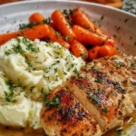 A flavorful dish featuring tender garlic herb chicken served with creamy mashed potatoes and glazed carrots.