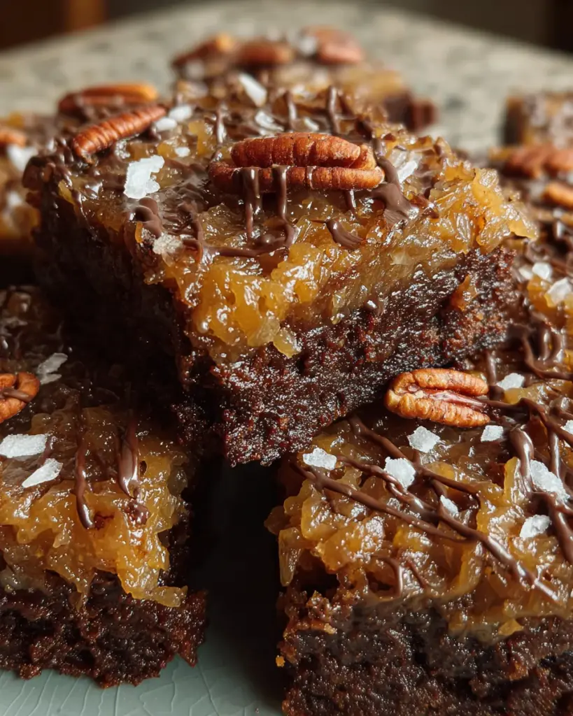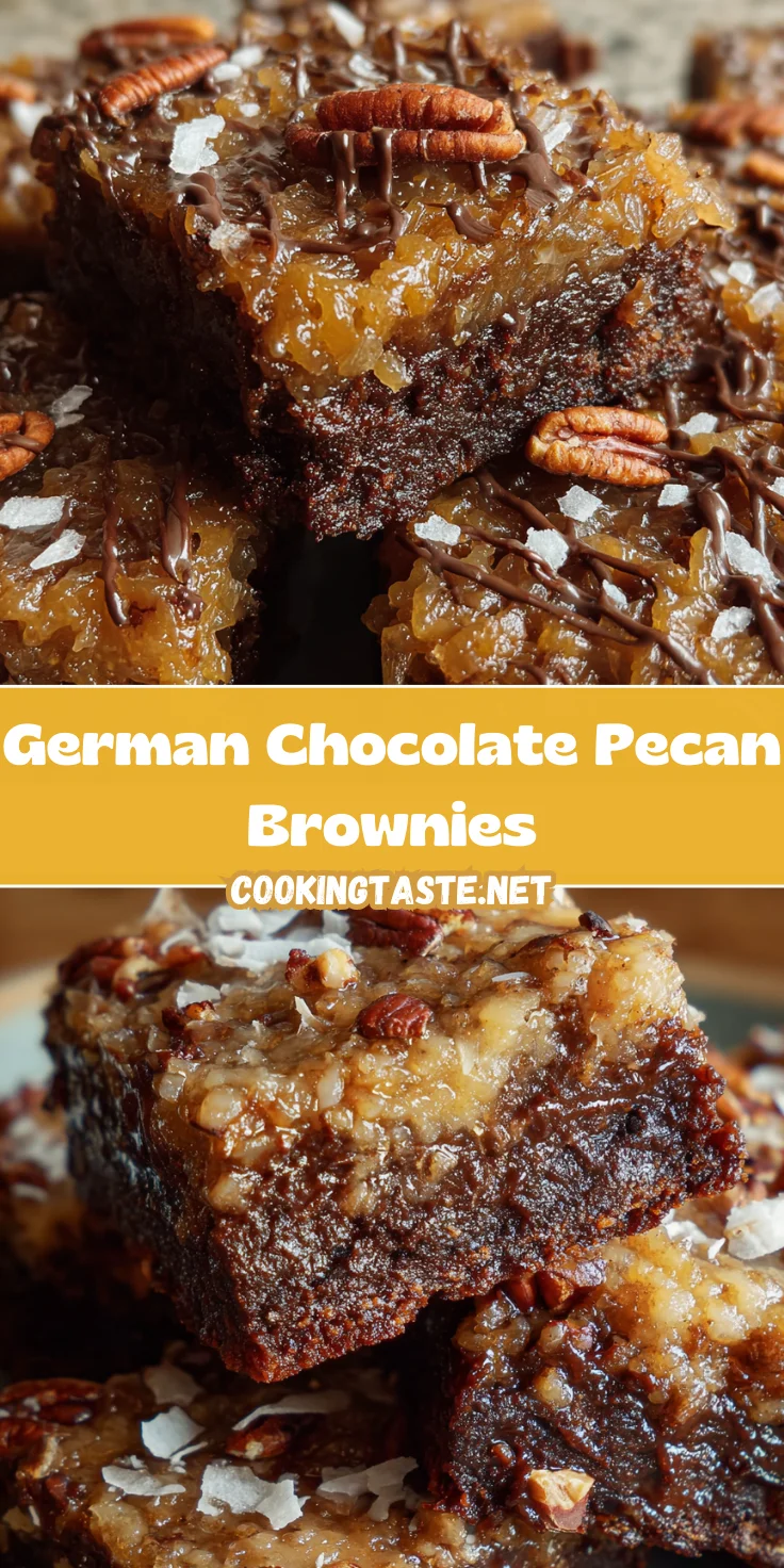 Deliciously rich German Chocolate Pecan Brownies topped with a sweet coconut and pecan mixture, perfect for any special occasion.