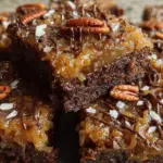 Deliciously rich German Chocolate Pecan Brownies topped with a sweet coconut and pecan mixture, perfect for any special occasion.