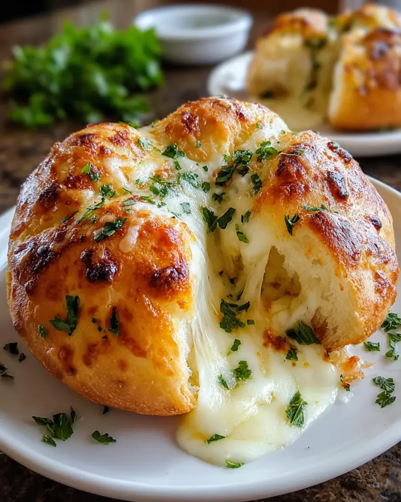 A delicious Giant Mozzarella-Stuffed Garlic Knot Pizza Bomb, perfect as an appetizer or snack.