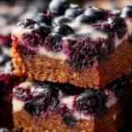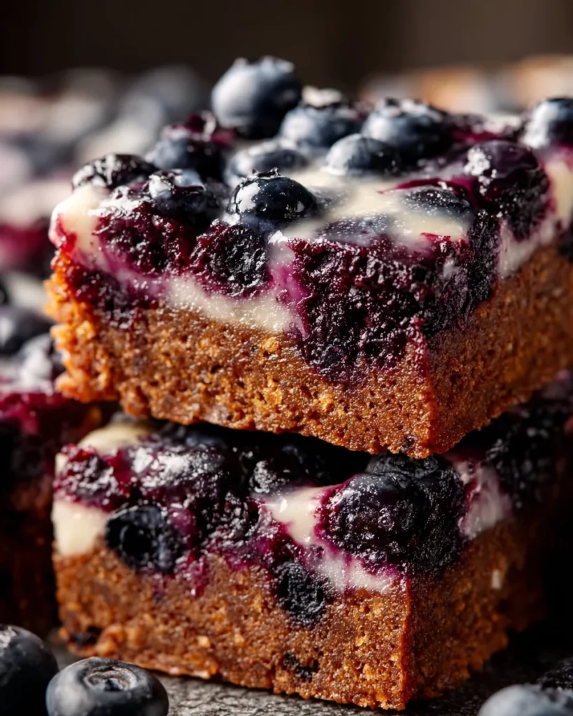 A delicious dessert combining the rich flavors of brownies with the sweetness of blueberries, topped with a silky glaze.