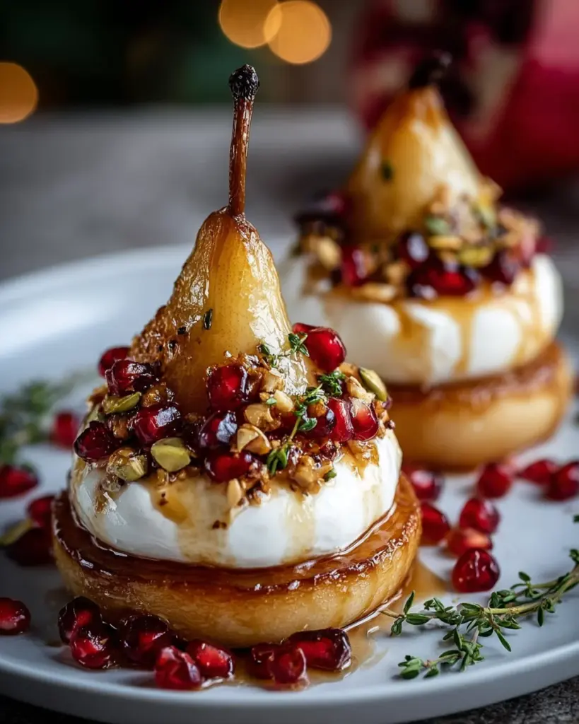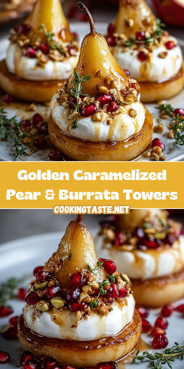 Golden Caramelized Pear & Burrata Towers is a delightful dessert featuring tender poached pears layered with creamy burrata and sweet mascarpone, drizzled with a rich caramel glaze.