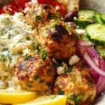 - Divide cooked rice among serving bowls. Arrange cucumber slices, cherry tomatoes, and Kalamata olives alongside. Add chicken meatballs and garnish with crumbled feta cheese and a generous spoonful of tzatziki sauce. Serve immediately with lemon wedges and pita if desired.