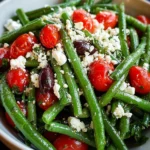 A refreshing salad featuring crisp green beans tossed with cherry tomatoes, fresh herbs, and crumbled feta cheese, dressed with a zesty lemon-garlic vinaigrette.