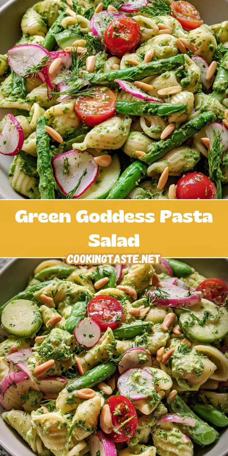 A vibrant and flavorful pasta salad featuring fresh vegetables and a creamy Green Goddess dressing, perfect for a light meal or side dish.