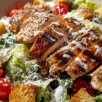 Finally, slice the grilled chicken and arrange it over the salad. Drizzle the remaining dressing on top, sprinkle with more Parmesan cheese, and finish with the rest of the croutons. Serve it up immediately and watch smiles appear at the dinner table!