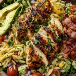 A refreshing and flavorful salad featuring grilled lemon herb chicken, avocado, and orzo pasta, perfect for a light meal.
