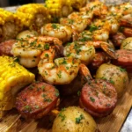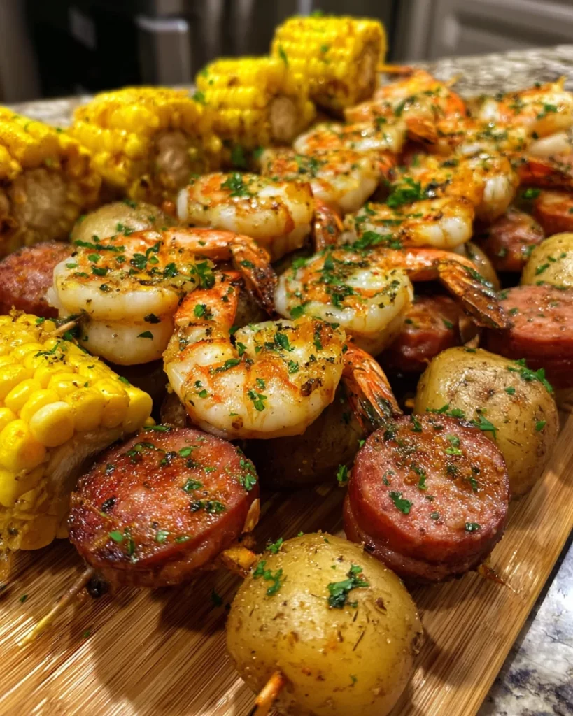 Grilled Seafood Boil Skewers are a delicious mix of shrimp, sausage, potatoes, and corn, all grilled to perfection and brushed with a flavorful crab boil garlic butter.