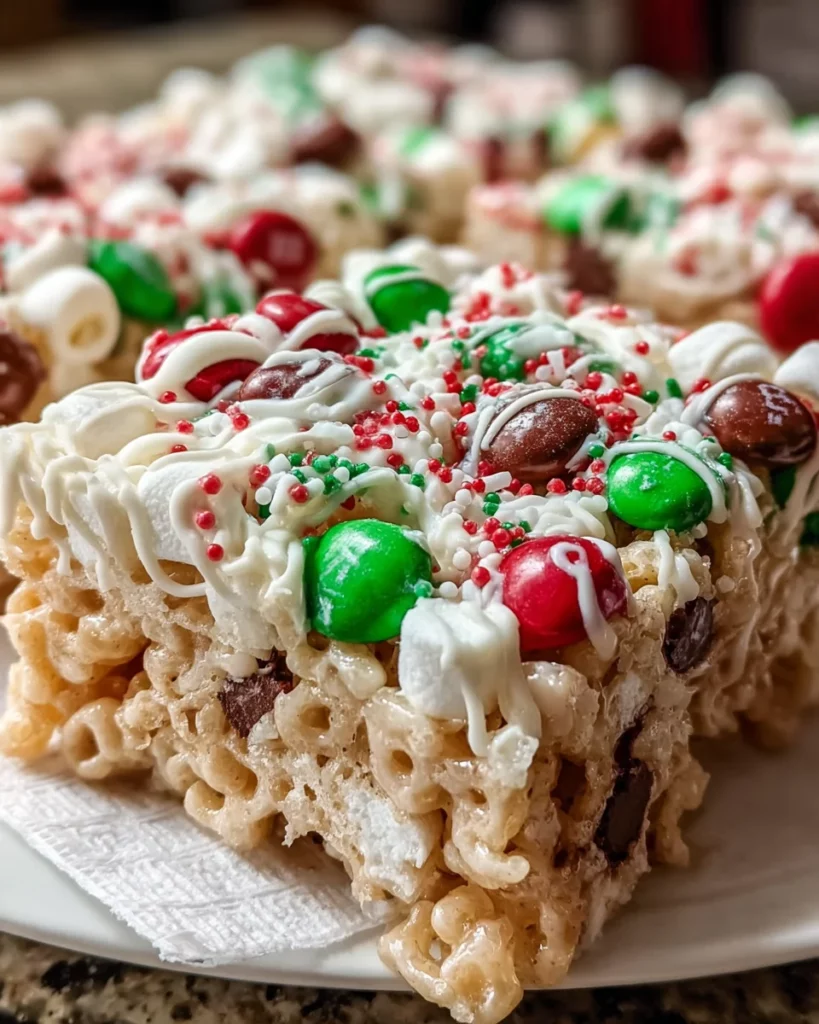 Delicious and festive Holiday Rice Krispie M&Ms Bars filled with colorful holiday treats.