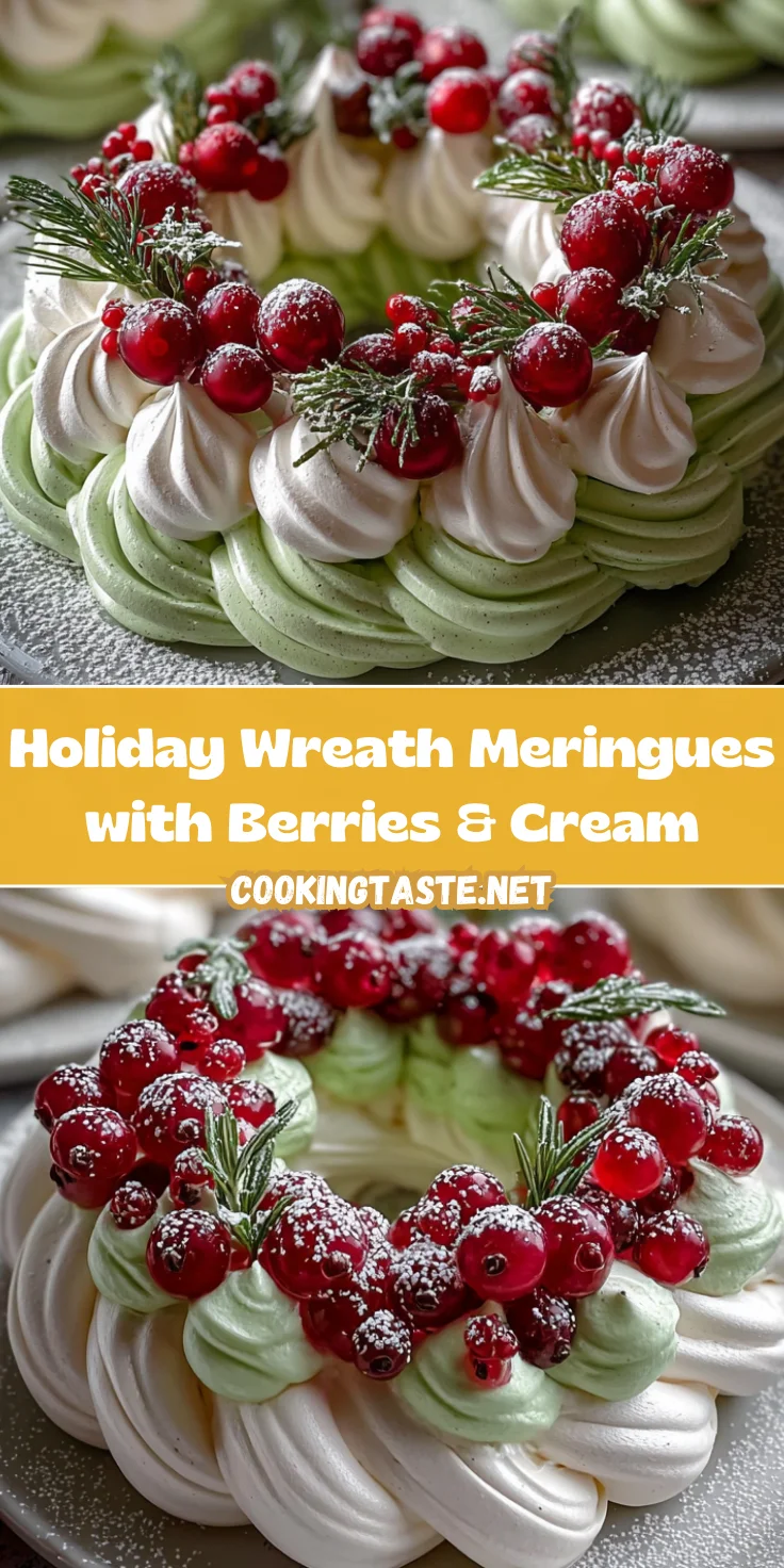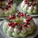 A festive dessert featuring delicate meringue wreaths topped with whipped cream and fresh berries, perfect for holiday celebrations.