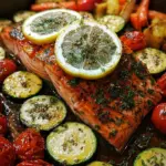 Now it’s time to season the zucchini and cocktail tomatoes. Sprinkle them with the remaining salt and pepper. Drizzle some olive oil over the vegetables to encourage that beautiful roasting magic. Arrange them around the salmon on the baking sheet, creating a colorful canvas of flavors!