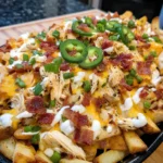 Jalapeño Bacon Ranch Chicken Cheese Fries are a delicious and indulgent dish featuring crispy fries topped with shredded chicken, bacon, melted cheese, jalapeños, ranch dressing, and green onions.