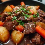 Your patience will be rewarded! Carefully transfer the cooked beef to a serving platter, letting it rest for a few minutes. Arrange the colorful veggies around the beef. Spooning several ladlefuls of that savory sauce over the top is essential. To finish, sprinkle with sliced green onions and toasted sesame seeds. Now, get ready for those happy faces around the dinner table!