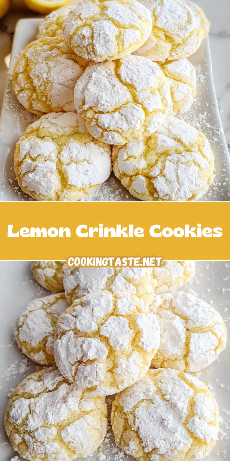 There’s a certain joy that comes from baking Lemon Crinkle Cookies. The process is not just about mixing ingredients; it’s about love, laughter, and possibly a few happy accidents along the way. As I bite into a warm, chewy cookie, I’m reminded of sunny days and cozy gatherings. They’re perfect for sharing, whether it’s a midday pick-me-up or a sweet treat for family and friends. Trust me, these cookies truly brighten your day! So, roll up your sleeves, gather your loved ones, and embrace the delightful experience of creating your own Lemon Crinkle Cookies today!