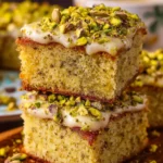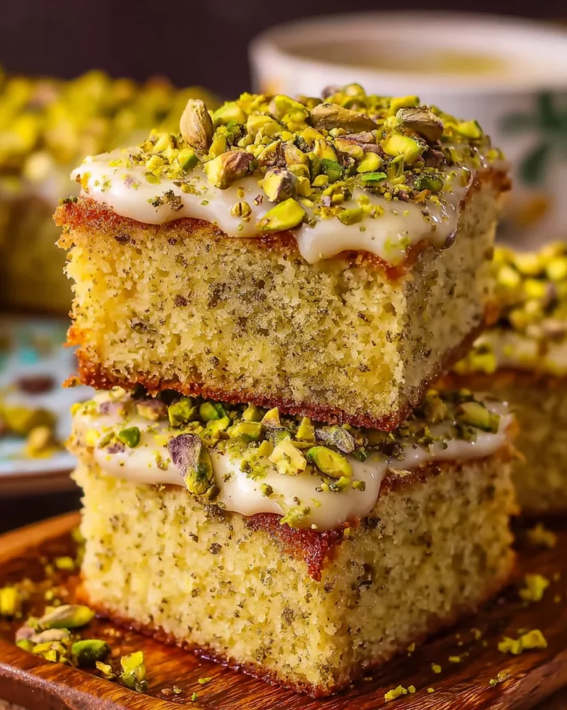 A delicious and moist Lemon Pistachio Milk Cake, perfectly complemented with a creamy frosting and a delightful milk soak, making it a wonderful dessert option.