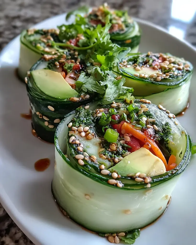 A refreshing and light dish featuring cucumber and avocado rolled with optional vegetables, perfect for a healthy snack or appetizer.