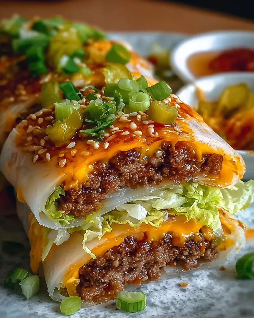 For assembling, place a slice of low-fat cheddar cheese in the center of each rice paper wrap. Layer on about 2 to 3 tablespoons of the beef mixture, followed by a generous portion of shredded iceberg lettuce and several slices of pickles. Carefully fold in the sides of the wrap and then roll tightly to encase the filling. Tuck in the edges snugly to prevent any filling from peeking out. Arrange the finished rolls seam-side down on your prepared baking tray, making sure they’re all cozy together!