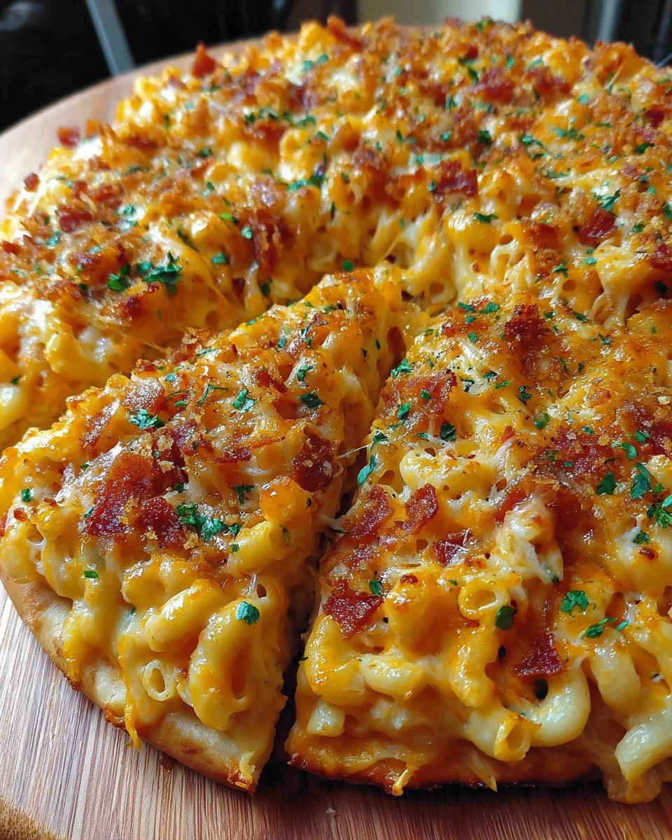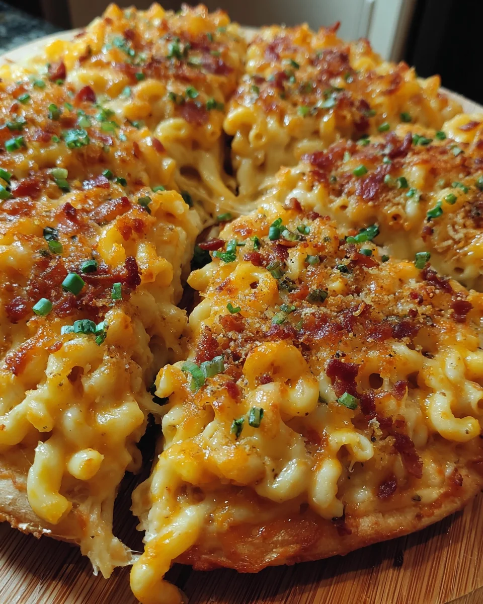 Macaroni and Cheese Pizza is a delicious fusion dish that combines classic macaroni and cheese with a crispy pizza base for an indulgent dinner option.