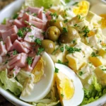 In a large mixing bowl, toss together your building blocks: shredded iceberg lettuce, cooked ham, turkey breast, and Swiss cheese. These ingredients are the heart of the salad, combining textures and flavors that sing in harmony.