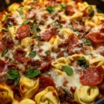 Meat Lovers Pizza Tortellini is a hearty dish combining cheese tortellini with Italian sausage, pepperoni, and bacon, all bathed in a flavorful marinara sauce and topped with melted mozzarella cheese.