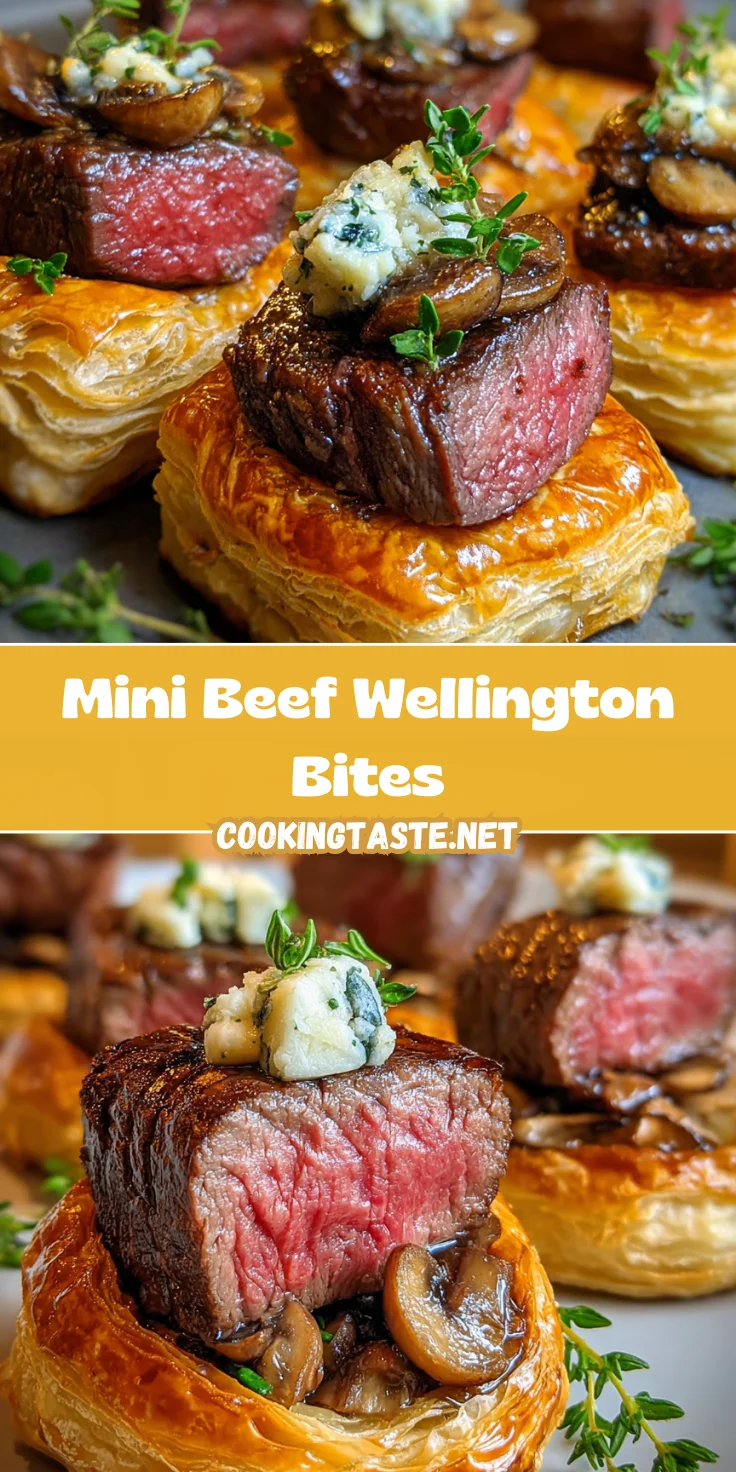 Mini Beef Wellington Bites are a delicious party treat featuring tender beef cubes enveloped in flaky puff pastry with flavorful mushroom duxelles.