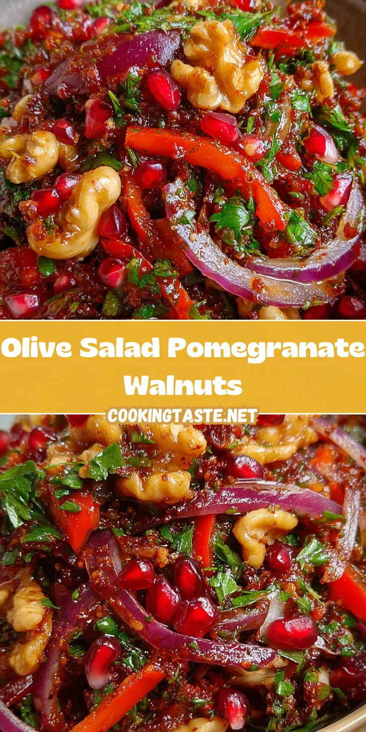 A vibrant and flavorful olive salad featuring pomegranate and walnuts, perfect for a refreshing side dish.