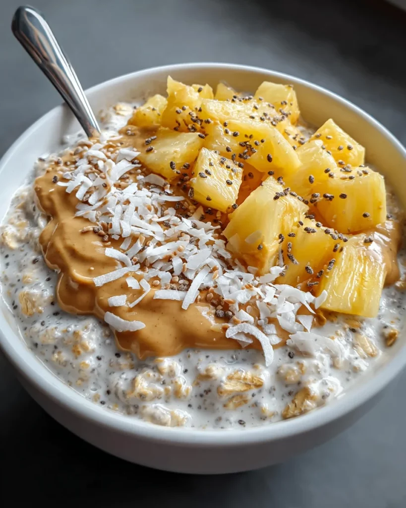 Enjoy your delightful overnight oats tropical peanut chilled, or let them warm up a bit if you prefer.