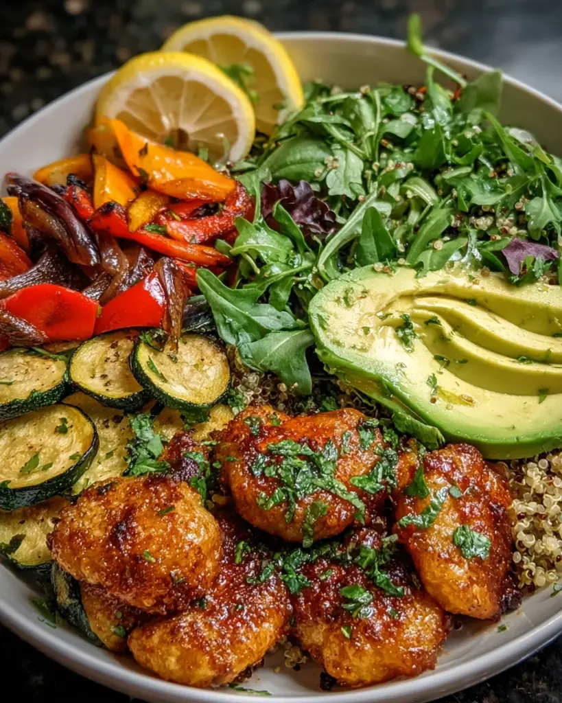 - Divide cooked quinoa among bowls, top with roasted vegetables, sliced chicken, lemon salad, and fresh avocado. Garnish with parsley if desired.