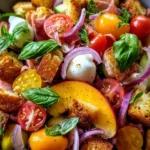 Peach Panzanella Salad Summer is a delightful and refreshing salad that combines sweet peaches, juicy tomatoes, and crispy bread, topped with a tangy vinaigrette.
