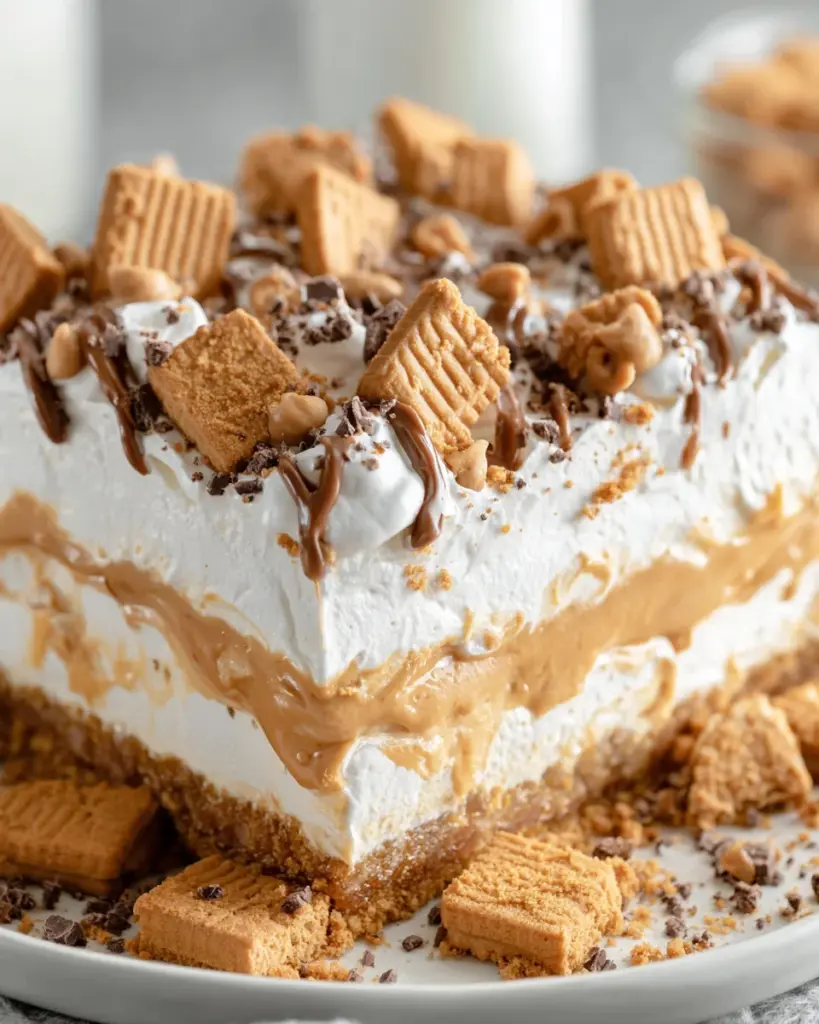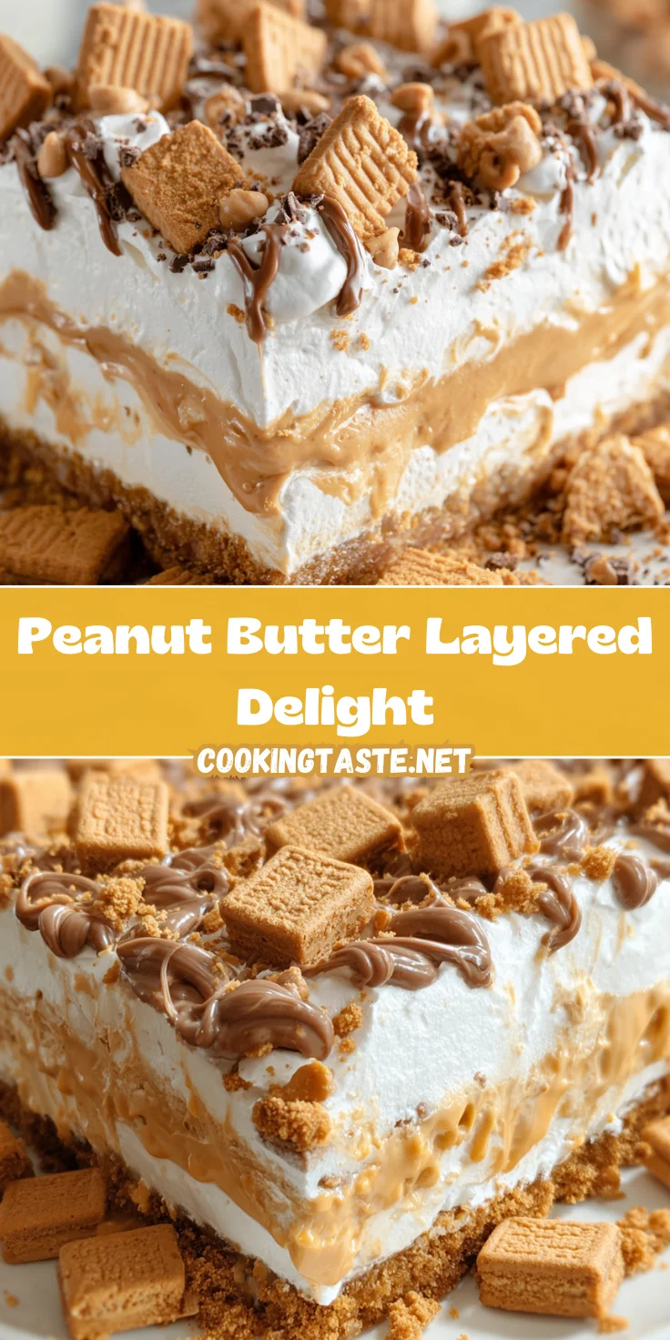 Peanut Butter Layered Delight is a creamy, rich dessert featuring layers of peanut butter, cream cheese, and whipped topping, all set on a crust of peanut butter sandwich cookies.