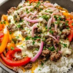 A comforting and delicious Philly Cheesesteak Bowl featuring seasoned ground beef, sautéed vegetables, and a creamy cheese sauce served over warm rice.
