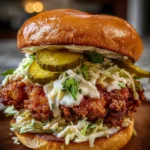Now that everything is ready, it’s time to assemble! Spread the creamy sauce evenly on both halves of each toasted bun. On the bottom half, layer your crunchy fried chicken thigh, followed by a generous heap of shredded lettuce or slaw mix, and a handful of sliced dill pickles. Cap it all off with the top half of the bun. Serve immediately while still warm for optimal flavor and texture!