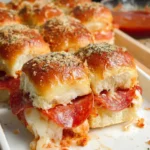 Pizza Sliders are delicious baked sandwiches filled with pepperoni, cheese, and pizza sauce, topped with a buttery Parmesan crust.