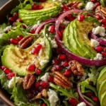 - In a large salad bowl, add the mixed greens, pomegranate seeds, red onion, and avocado slices.
