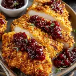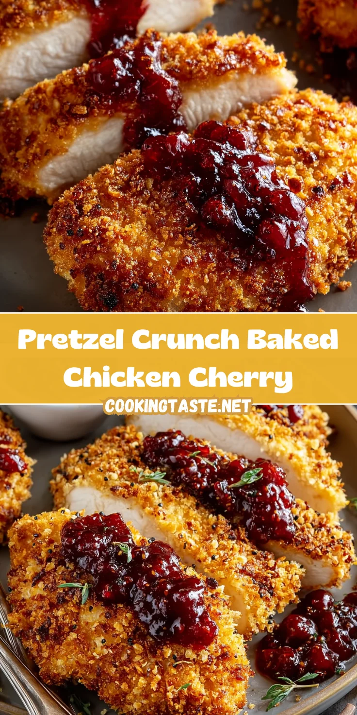 Pretzel Crunch Baked Chicken Cherry is a delightful dish featuring tender chicken breasts coated in a crunchy pretzel crust, topped with a flavorful cherry mustard drizzle.