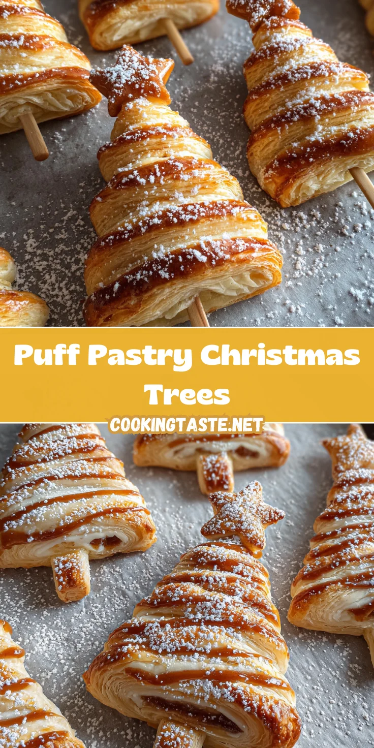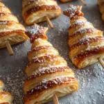 After baking, carefully remove your pastries from the oven and let them cool slightly on the tray. Just before serving, dust them with icing sugar. This finishing touch adds a beautiful snowy effect that’ll make your Puff Pastry Christmas Trees truly festive!