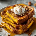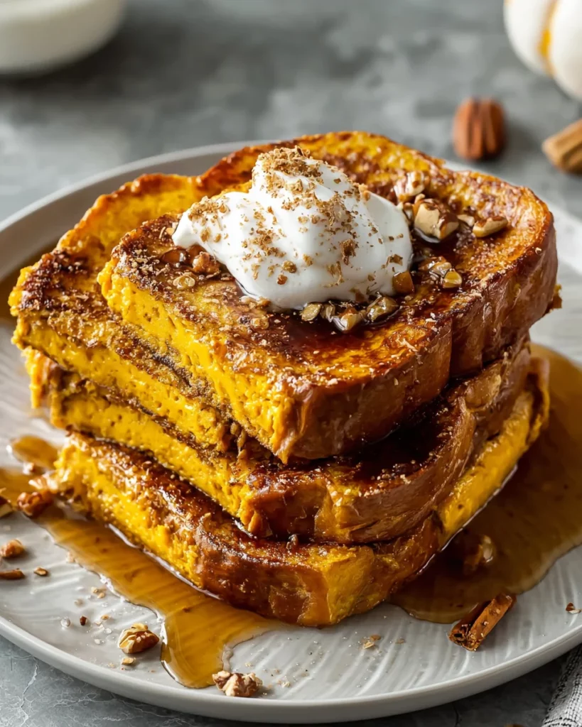 A delicious and festive breakfast treat that combines the flavors of pumpkin and cream cheese in a delightful French toast dish, perfect for fall.