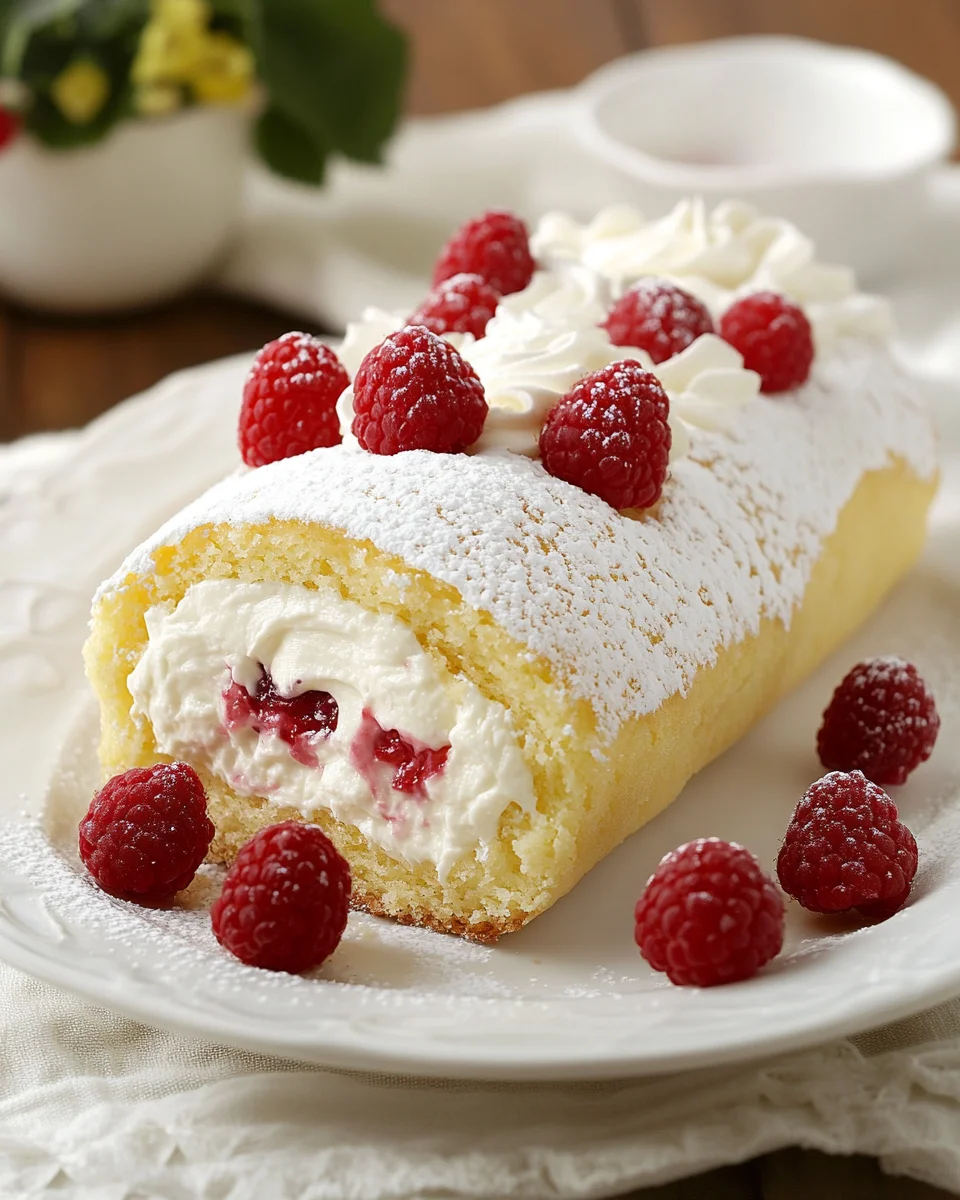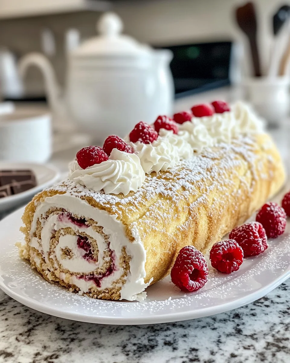 Wrap the cake roll tightly in plastic wrap and refrigerate for at least one hour to set. This chilling time allows the flavors to meld beautifully. Before serving, dust the top with powdered sugar and decorate with fresh raspberries and white chocolate shavings. When you slice into this beauty, the vibrant colors and flavors will make your heart sing!