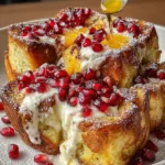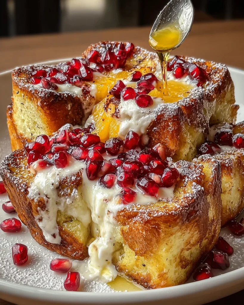 Ricotta Pomegranate Baked Toast is a delightful morning treat featuring a creamy ricotta filling and a topping of fresh pomegranate seeds, baked to perfection.