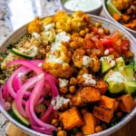 Once everything is together, it’s time to plate up! Start with a generous serving of quinoa at the base. Layer on your roasted veggies and chickpeas, followed by the fresh greens. Add cucumbers, tomatoes, pickled red onions, and avocado slices. Finally, finish it off with a dollop of tzatziki sauce and a drizzle of tahini dressing. Enjoy the wonderful textures and flavors blending together in each bite!
