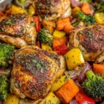 Everything is coming together now! Spread the seasoned vegetables into a single layer on your prepared baking sheet. It’s important not to crowd them; giving them space allows for that caramelized goodness. Place the chicken thighs skin-side up right on top of the veggies. This way, those juicy flavorful chicken drippings will infuse into the vegetables as they roast, creating a symphony of flavors!