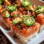 Finally, it’s time for the grand assembly! Start by placing a slice of creamy avocado on each crispy rice piece. Next, add a generous scoop of your spicy salmon mixture, then top with thinly sliced jalapeños for a kick. Finish with a sprinkle of toasted black and white sesame seeds to jazz up the presentation. Your Salmon Crispy Rice is ready to be enjoyed!