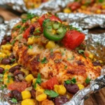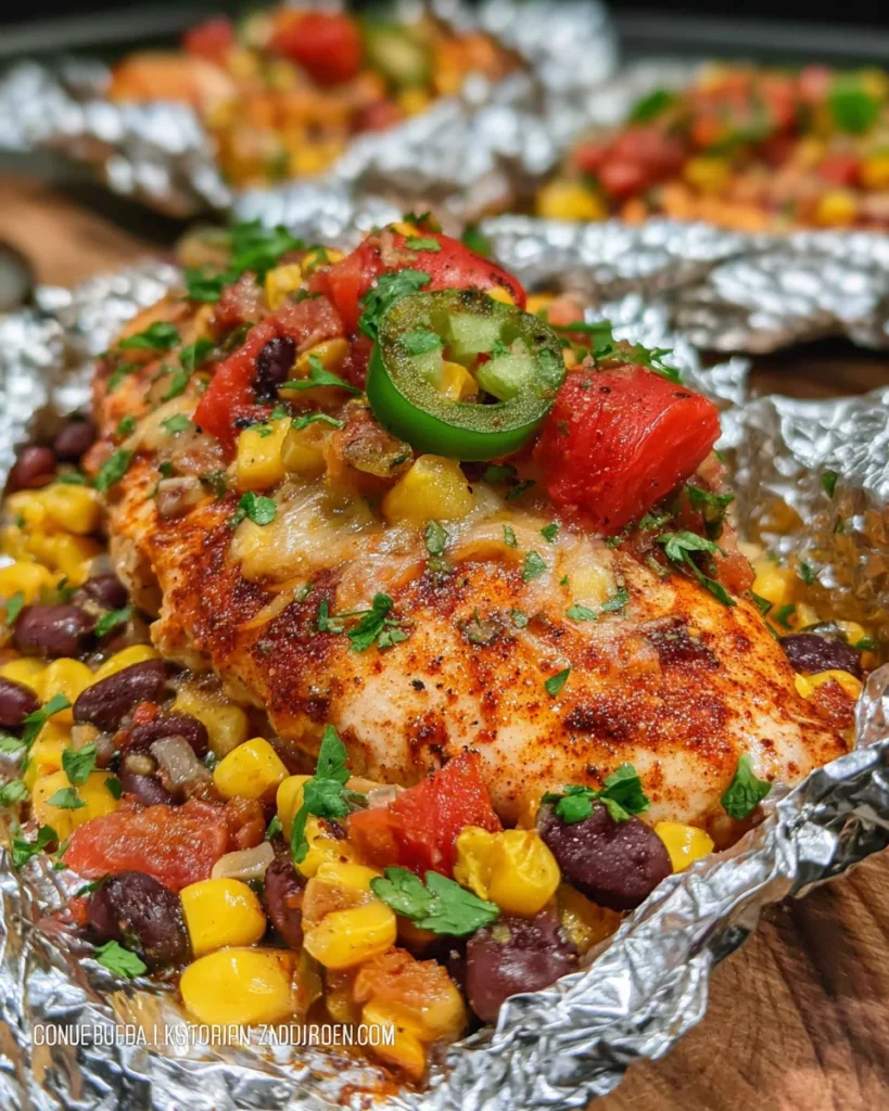 A delicious and easy grilled dish featuring chicken, beans, corn, and salsa, all cooked in foil packets for a flavorful meal.