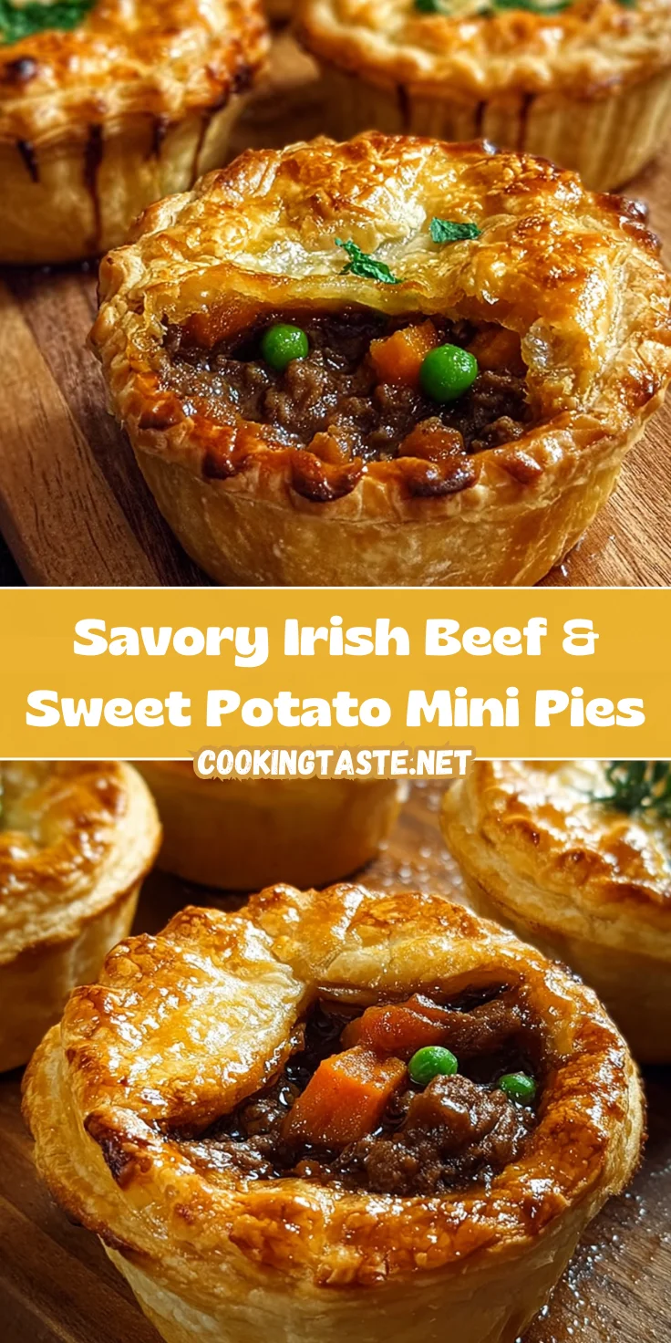Savory Irish Beef & Sweet Potato Mini Pies delightfully cradled in flaky pastry, combining rich beef stew and sweet potato mash in a tender crust.