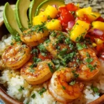 Top each bowl with the cooked shrimp, diced ripe mango, sautéed bell pepper, sliced avocado, and halved cherry tomatoes. It’s a feast for both the eyes and the stomach!