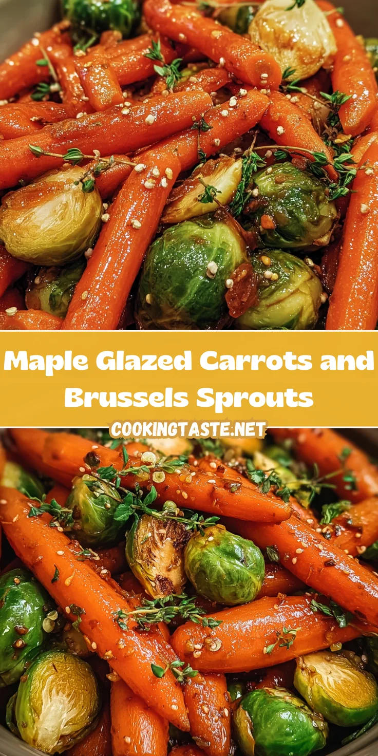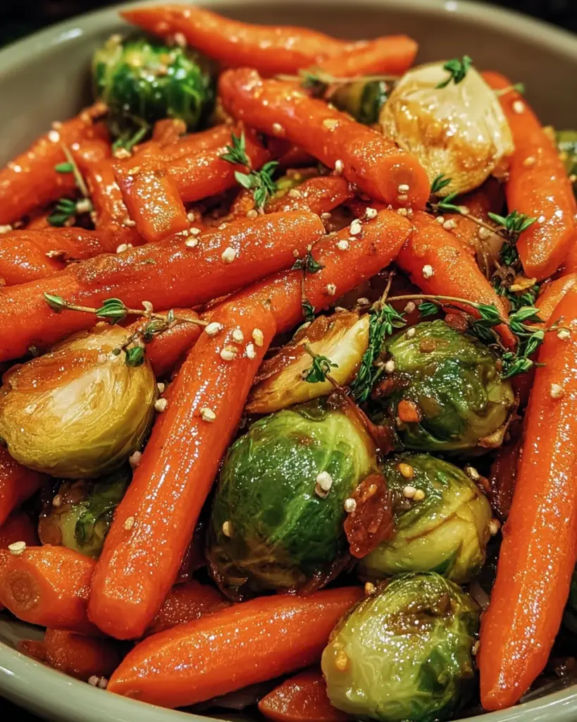 A delicious side dish of tender baby carrots and Brussels sprouts glazed in a sweet maple syrup sauce, perfect for any meal.
