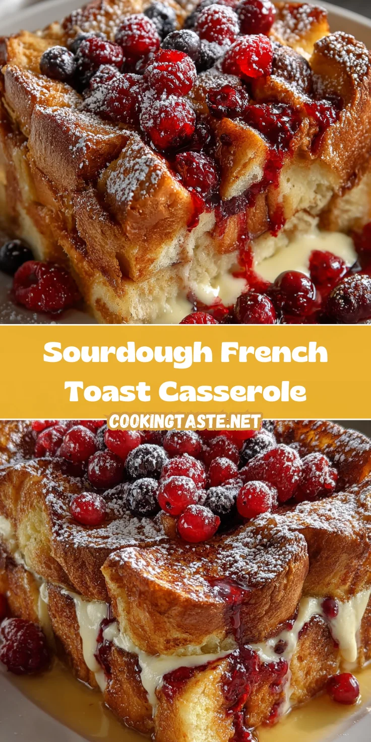 A delightful baked casserole made with sourdough bread, eggs, and a creamy custard, topped with a mixed berry compote.