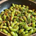 - Add the cooked edamame to the skillet, tossing to coat them in the spicy garlic oil.
