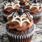 Delicious chocolate cupcakes decorated with a spooky spider web design, perfect for Halloween.